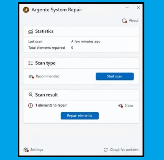 Egy kiváló program az Argente System Repair ami átfogó hibakeresési műveleteket tud Windows rendszeren futtatni. A szoftver betekintést is biztosít a Windows hibákba amelyeket talált. Gyakran csak akkor döbbenünk rá egy-egy probléma súlyosságára, amikor már komolyabb zavart okoz a Windows működésében. Azonban ezzel a programmal akár információkat is megtudhatunk.