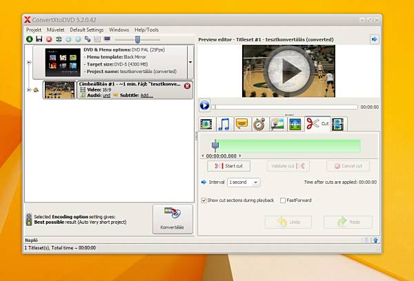 Ha betallóztad az átalakításra szánt videódat, néhány alapvető de talán nélkülözhetetlen beállítást is végre tudsz hajtani annak valós kivitelezése előtt. Többek között saját képnormát és felbontást is lehet használni, illetve vághatóak azok a részek amik fölöslegesek, ez inkább felvett tartalmak esetén lehet hasznos ahol a reklámokat lehet belőle kiszedni. A beállítások végeztével a ConvertXtoDVD kezelőfelületén válaszd a konvertálás gombot, ennek megvalósításával el is kezdődik az érdembeli munka.