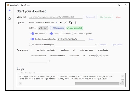 A Cube YouTube Downloader egy felirat, azonkívül metaadatokkal elérhető YouTube Videók letöltéséhez használható megoldás amivel akár több elterjedt kodek fájlformátumban lehet akár teljes lejátszólistákat a számítógépre eltárolni. A szoftver egy feladatban rengeteg Videó letöltéséhez hatékony. Nem kell installálni.