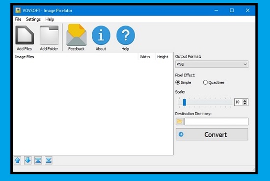 A részletgazdag konfigurációval futtatható képszerkesztő program a VOVSOFT Image Pixelator a fotóinkat effektezi, pontosabban mondva pixelhatású fájllá tudja alakítani. BMP, JPG, PNG fotók nyithatóak meg amivel azokat az igényeinkhez igazíthatjuk, konvertálhatjuk, azonkívül pixelálhatjuk. Konfigurálható a módszer és az intenzitás.