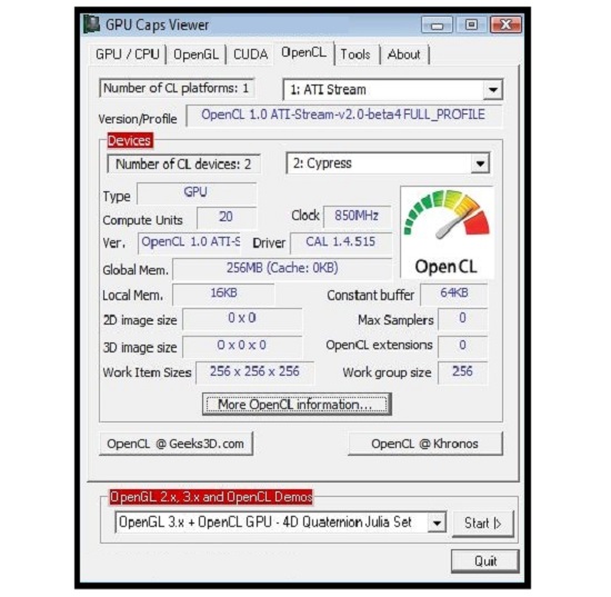 A GPU Caps Viewer ingyenes eszköze a grafikus kártyák, GPU-k részletes információinak megjelenítésére szolgál. A Free alkalmazás lehetővé teszi a felhasználók számára, hogy gyorsan át tudják tekinteni a számítógép konfigurációját, a processzor, a memória, az operációs rendszer, beleértve a videó kártya típusát, a VRAM mennyiségét. Az OpenGL, OpenCL és CUDA API támogatási szintjét, a hőmérsékletüket. Részletes jelentéseket készít szöveges vagy XML formátumban. GPU stressz teszteket is futtathatunk.