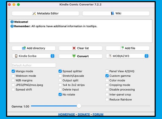 Akár az eredeti minőségben tudjuk a fájljainkat konvertálni aminek a sajátossága a széles körű formátum támogatás. JPG, PNG, GIF formátumokat is meg tud nyitni a Kindle Comic Converter, majd ezeket a fájlokat optimalizálva MOBI, CBZ, AZW3, KEPUB, EPUB formátumra alakítja át. Biztosítja, hogy szinte bármilyen digitális képregény vagy képgyűjtemény olvashatóvá váljon az általunk preferált eszközön.
