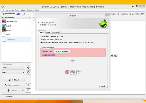 Néhány fontos, de nélkülözhetetlen szerkesztési lehetőséget is szolgáltat akár közvetlen metaadat hozzáférés formájában. A végeredményt több elgondolás alapján is meg lehet osztani. A jAlbum több programcsomag formájában is elérhető, többek között hagyományos installer, továbbá hordozható megoldásként, ami egy USB kulcsról is futtatható, A próbaverziós változatát 30 napig tesztelheted. Bővebb információ róla a hivatalos oldalon.