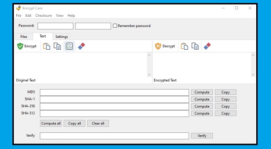 Egy paneles felhasználói felülettel elérhető alkalmazás amivel fájlokat, illetve szöveges tartalmakat lehet titkosítani. AES, Blowfish, CAST, DES módszerrel tudja az Encrypt Care a fájlokat titkosítani ami akár a tartalmak MD5, SHA-1, SHA-256, SHA-384 Hash ellenőrzőösszegeinek a generálásához is eredményes.